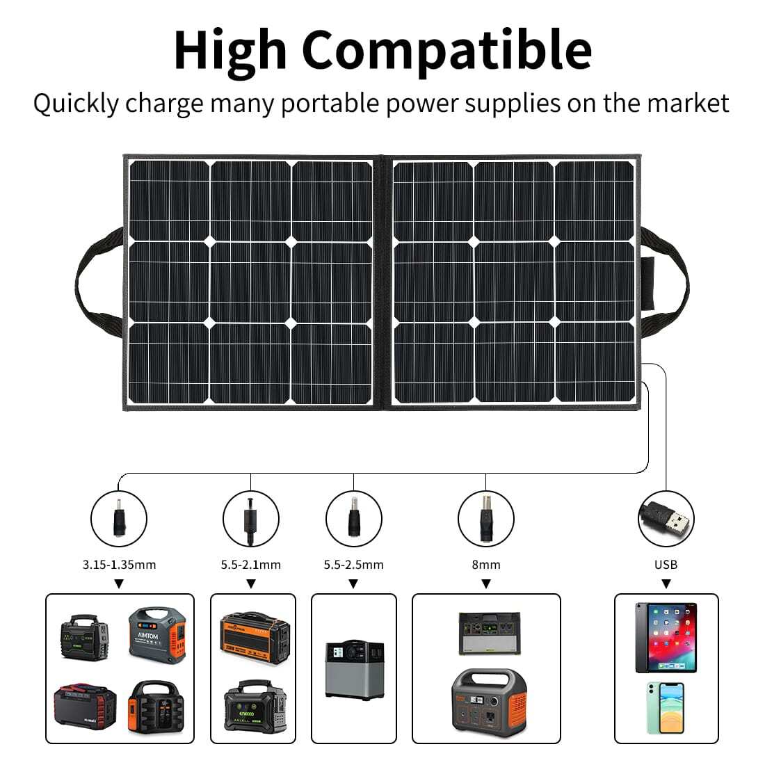 | Compatibility | Compatible with most solar generators on the market, such as Goal Zero, Suaoki, Paxcess, Flashfish, etc. |